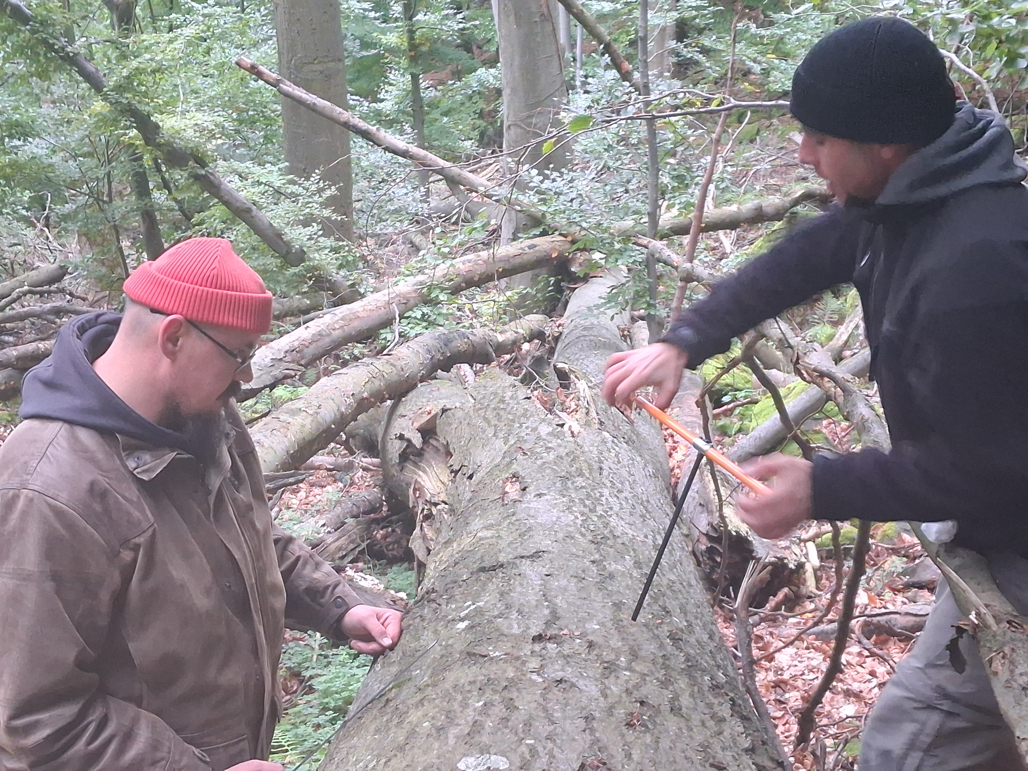 Ezért - a HUN-REN ÖK ÖBI Erdőökológiai Kutatócsoport részéről Horváth Ferenc, és a MATE VTI, Természetvédelmi és Tájgazdálkodási Tanszék részéről Saláta Dénes egyetemi docens megterveztünk egy projektet a legnagyobb - feltehetően egyúttal legöregebb - bükkfák korának és évgyűrűnövekedési profiljának megismerésére! A reprezentatív mintavételt kizárólag holtfákra korlátoztuk, álló vagy fekvő holtfa törzsekre, hogy a fúrással még a látszatát is elkerüljük a "destruktív" beavatkozásnak a fokozottan védett területen.